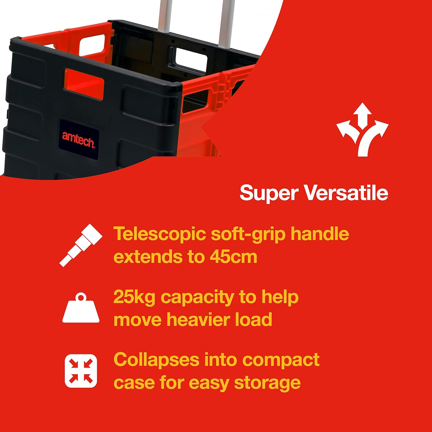 FOLDABLE: Easy to assemble with a plate and wheels that open with a single grip, this cart is collapsible and foldable to fit into any car boot and even under the bed. Also with a soft-grip telescopic handle that extends up to 45cm to minimise your load.