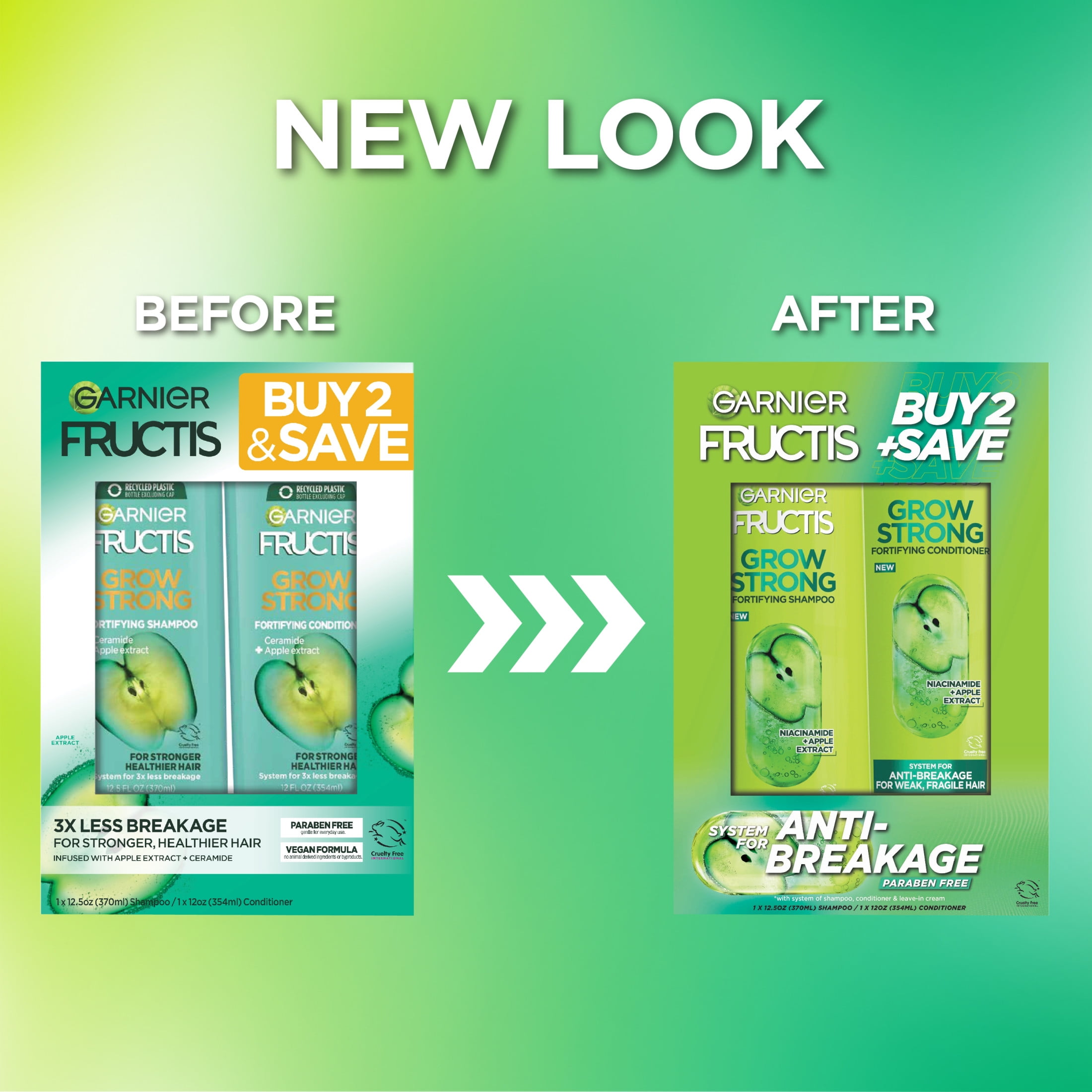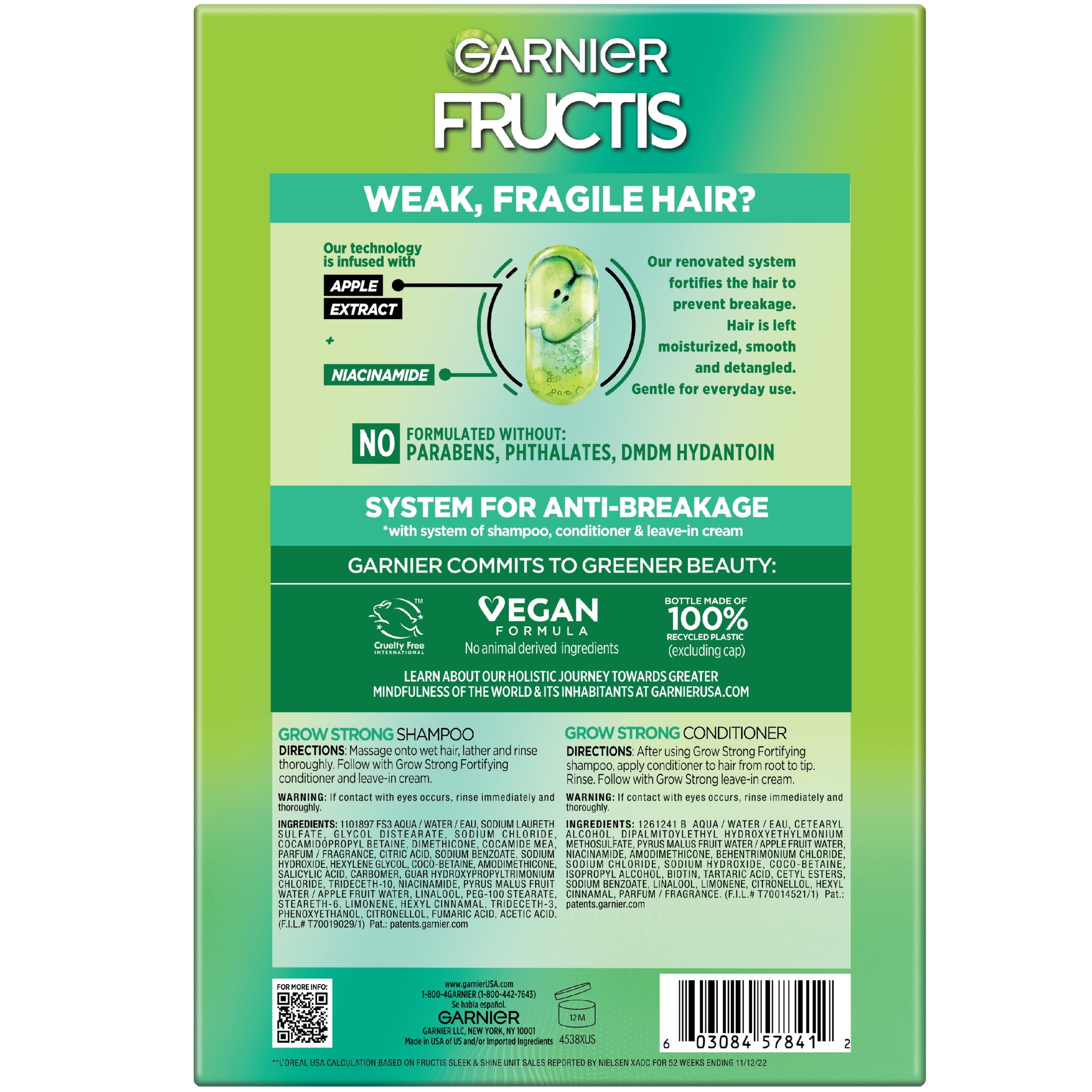 Garnier Fructis Grow Strong Squeeze Shampoo & Conditioner For Stronger, Healthier, Shinier Hair, Fructis Grow Strong Shampoo and Conditioner are infused with Apple Extract and Ceramide for stronger, healthier hair. Get up to 3x less breakage with a system of shampoo and conditioner. COMMITTED TO MAKING GARNIER A GREENER BEAUTY BRAND: As a leading global beauty brand, we aspire to create a positive impact by paving the way towards more and more sustainable beauty that’s accessible to all of us. Additionally, all Garnier products, globally, are officially approved by Cruelty-Free International under the Leaping Bunny Programme. Made for adults, this smoothing & straightening shampoo and conditioner are in a convenient squeeze dispenser for easy, mess-free application.