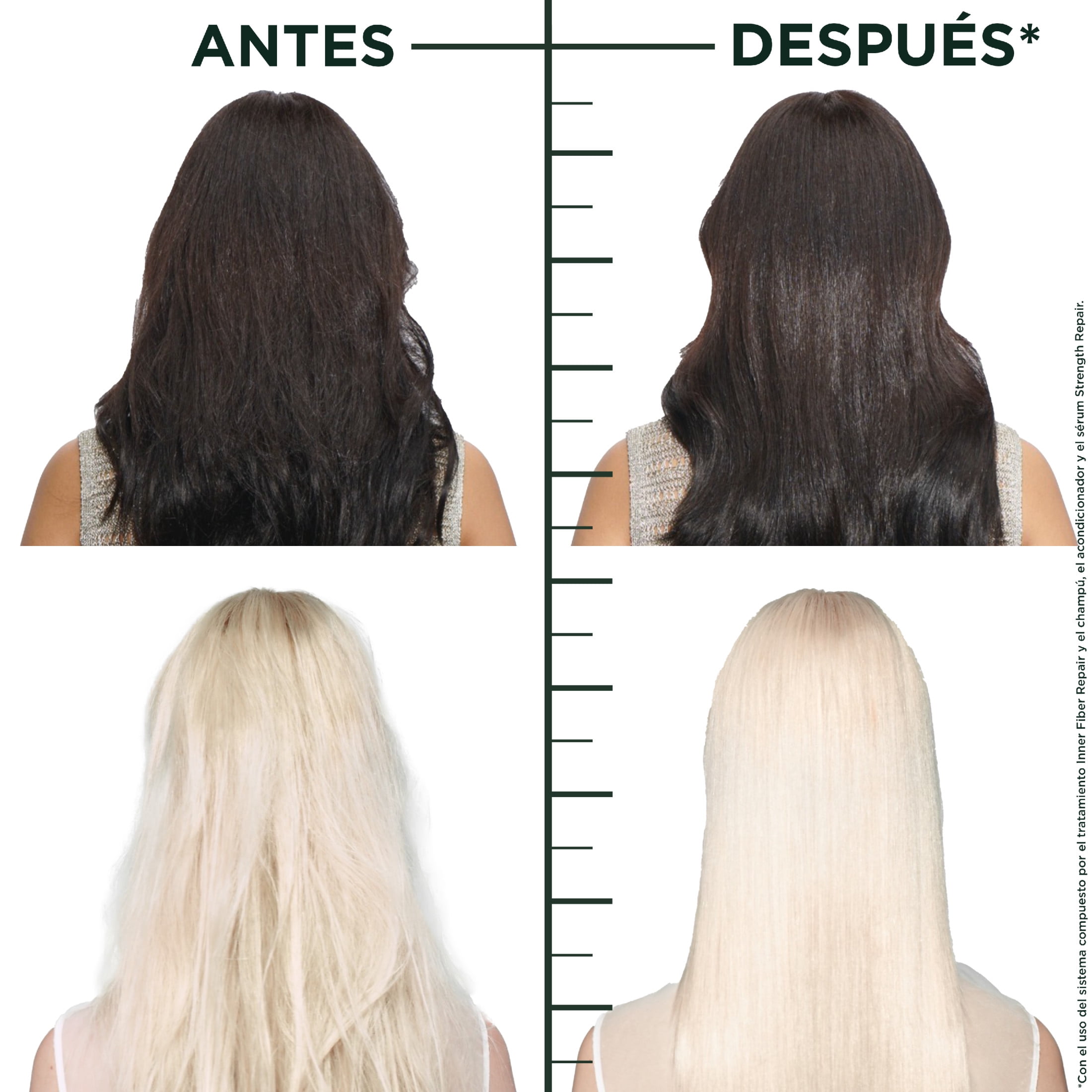 Up to 79 percent stronger hair with up to 4x less breakage with the use of Inner Fiber Repair Treatment and Strength Repair Shampoo, Conditioner, and Serum vs. non-conditioning shampoo