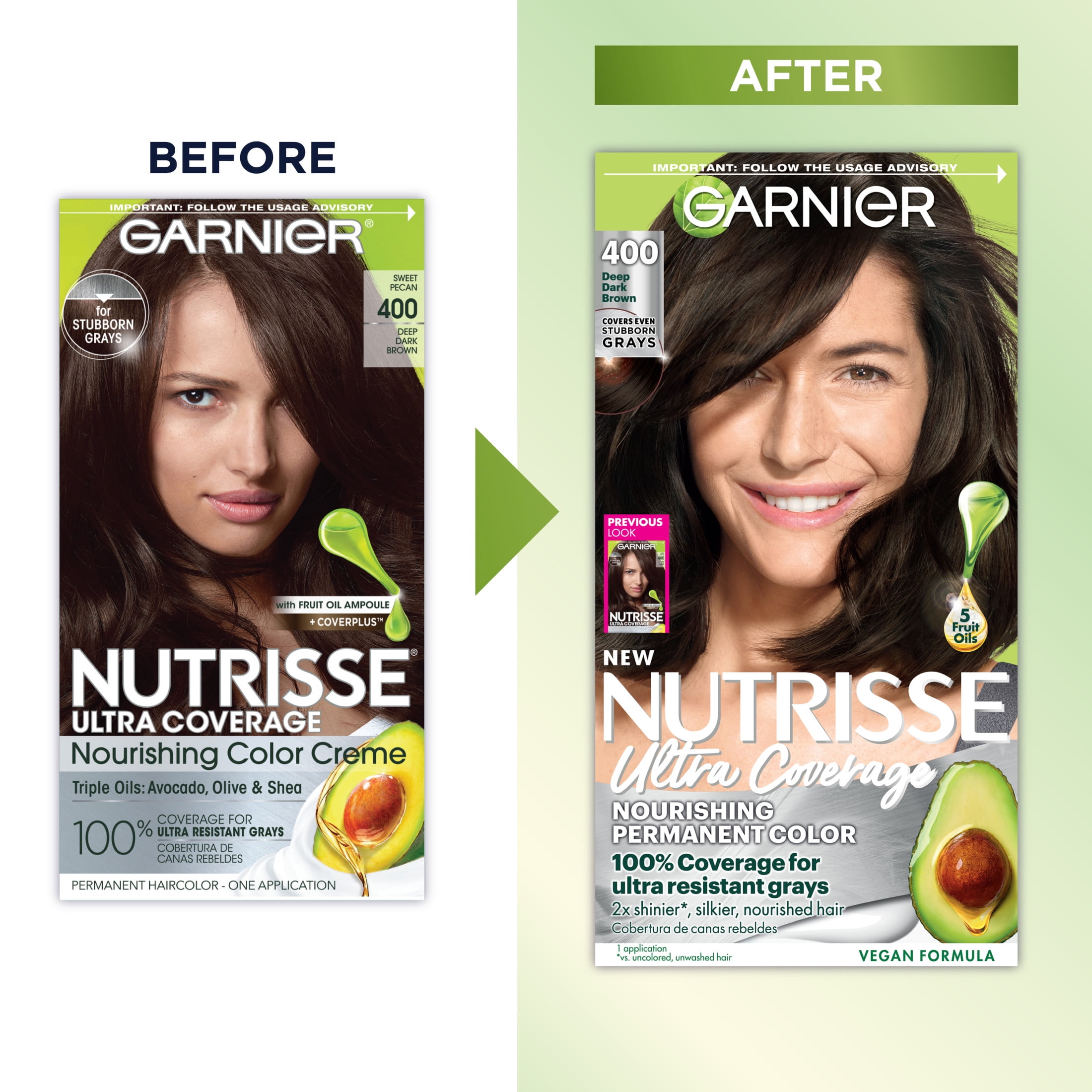 Garnier Nutrisse Nourishing Hair Color Creme, 400 Deep Dark Brown Sweet Pecan, Looking to cover ultra-resistant grays? Garnier Nutrisse ultra coverage nourishing color creme not only gives you rich, radiant color for silkier, shinier hair, but is the first at-home hair color. While balanced reflects mimic hair’s highs and lows. Lock in moisture for nourished hair with it’s creamy after color conditioner infused. Nutrisse ultra coverage’s non-drip creme formula is easy to use and smells great. Packaging may vary.