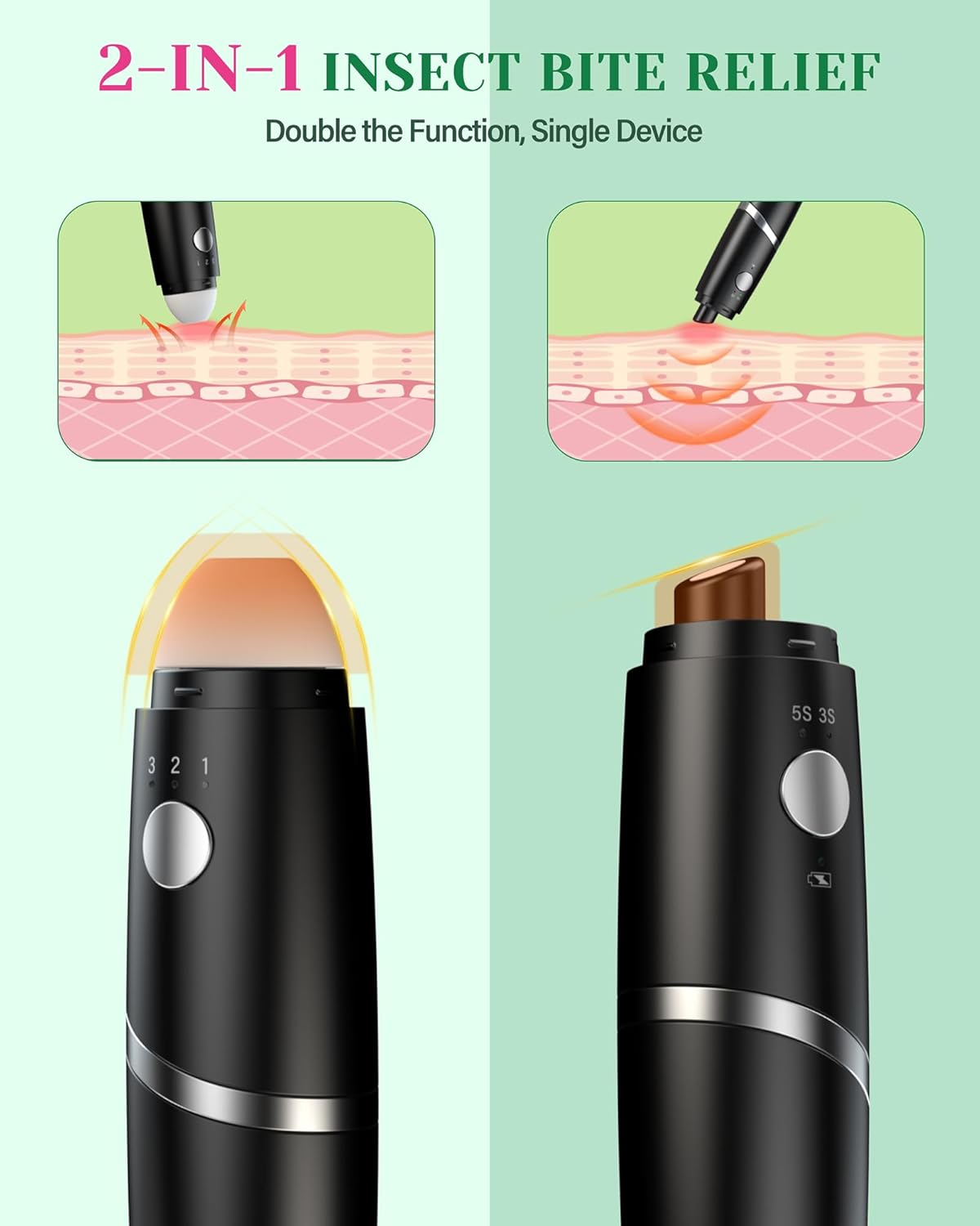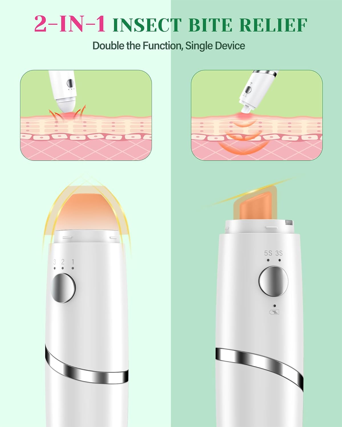 Unique 2-In-1 Gadget for An Itch-Free Summer: Just press the button, choose your mode, and apply it to your bite or sting. Surprisingly, this single device doubles the function. The suction tool tip can extract the irritants after bug bite, and the heat impulse tip works just with concentrated heat, both of which can help you get rid of the itching or swelling in seconds.