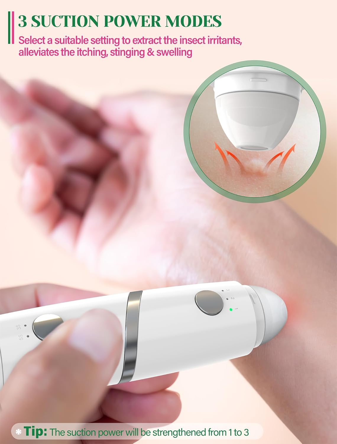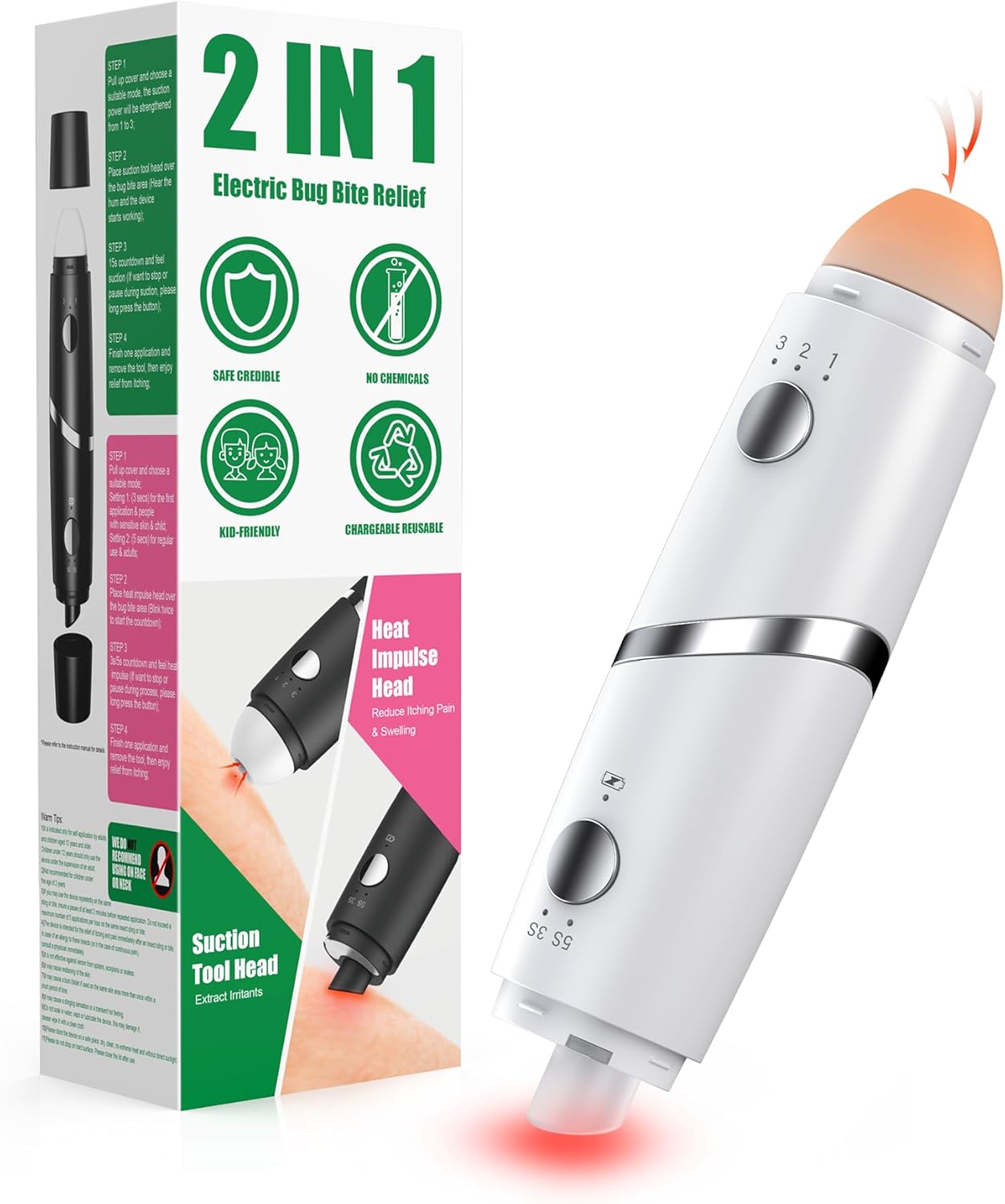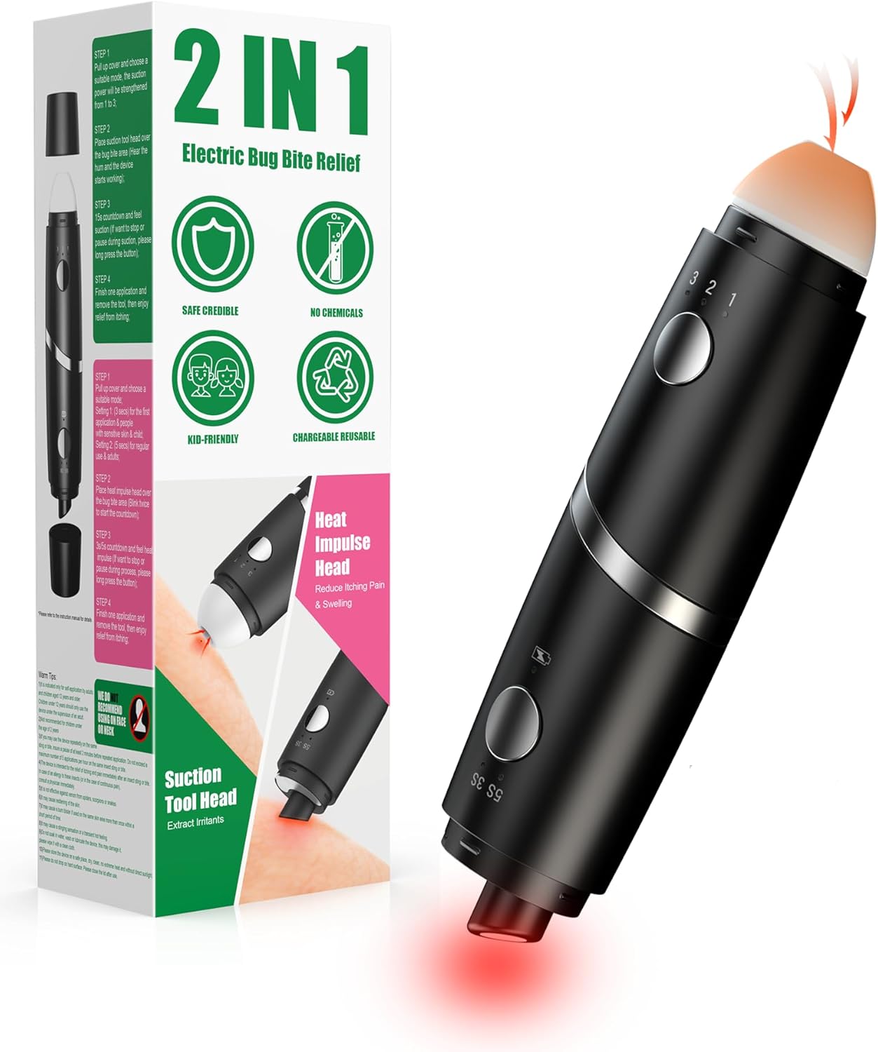 Chemical-Free Relief for Whole Family: This bug bite relief works with safe and physical technology, only with heat and suction power. No chemicals or mess, suitable for pregnant women and children. Warm tips: The heat tip is recommended for ages 12+, and the suction tool suitable for everyone.