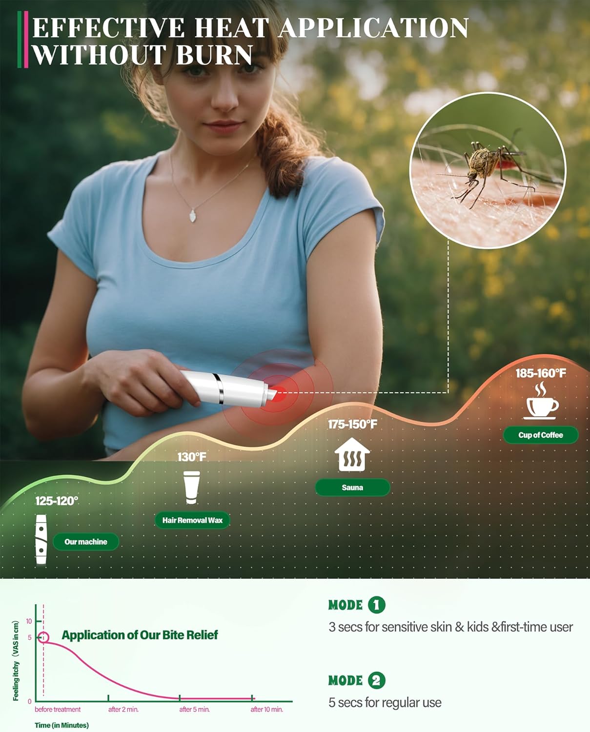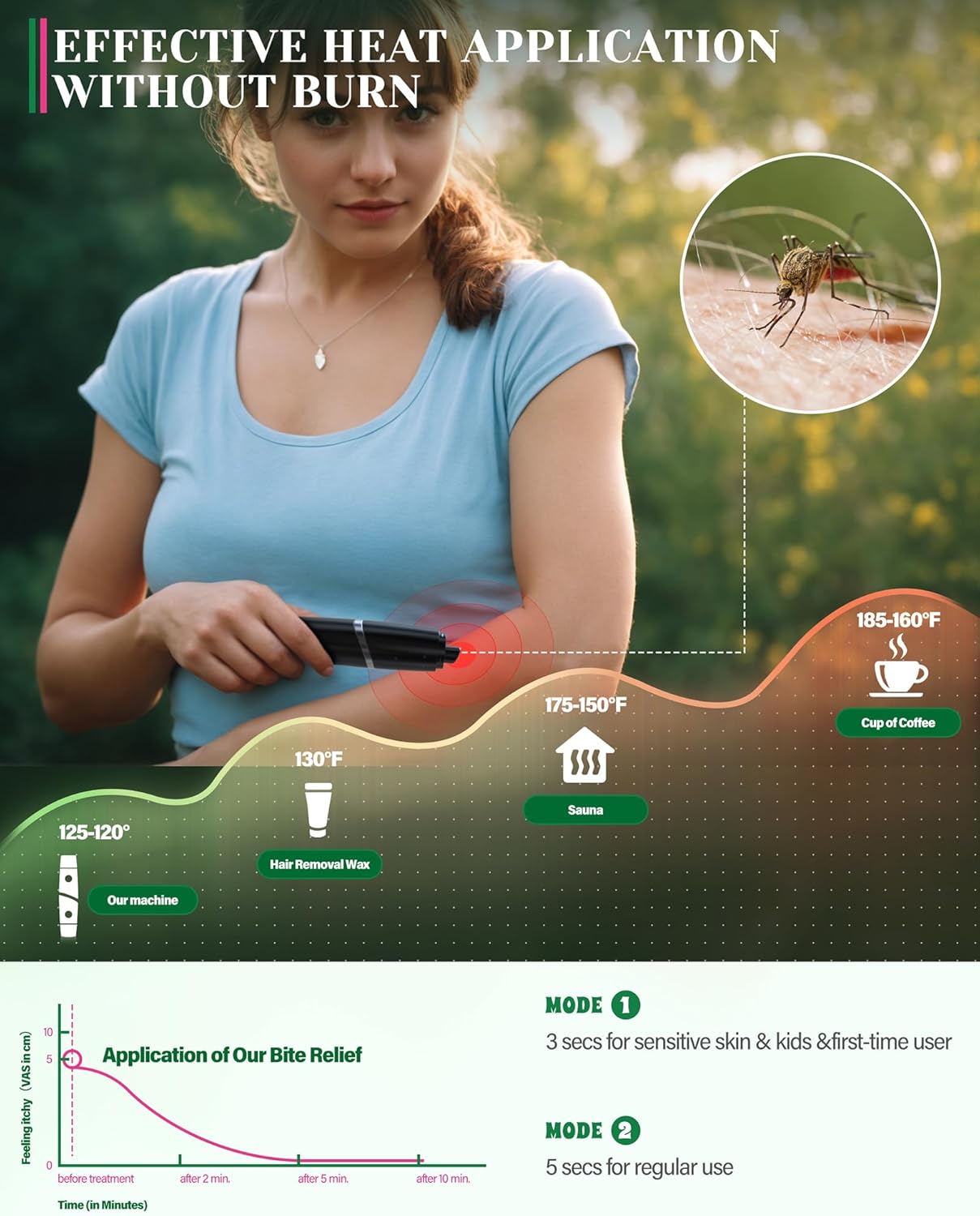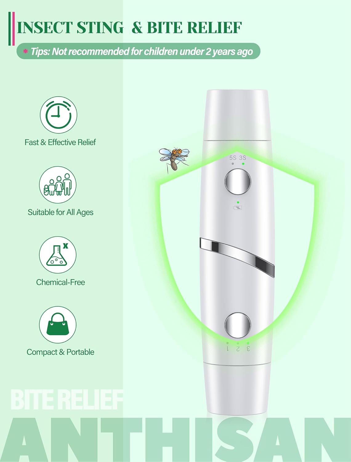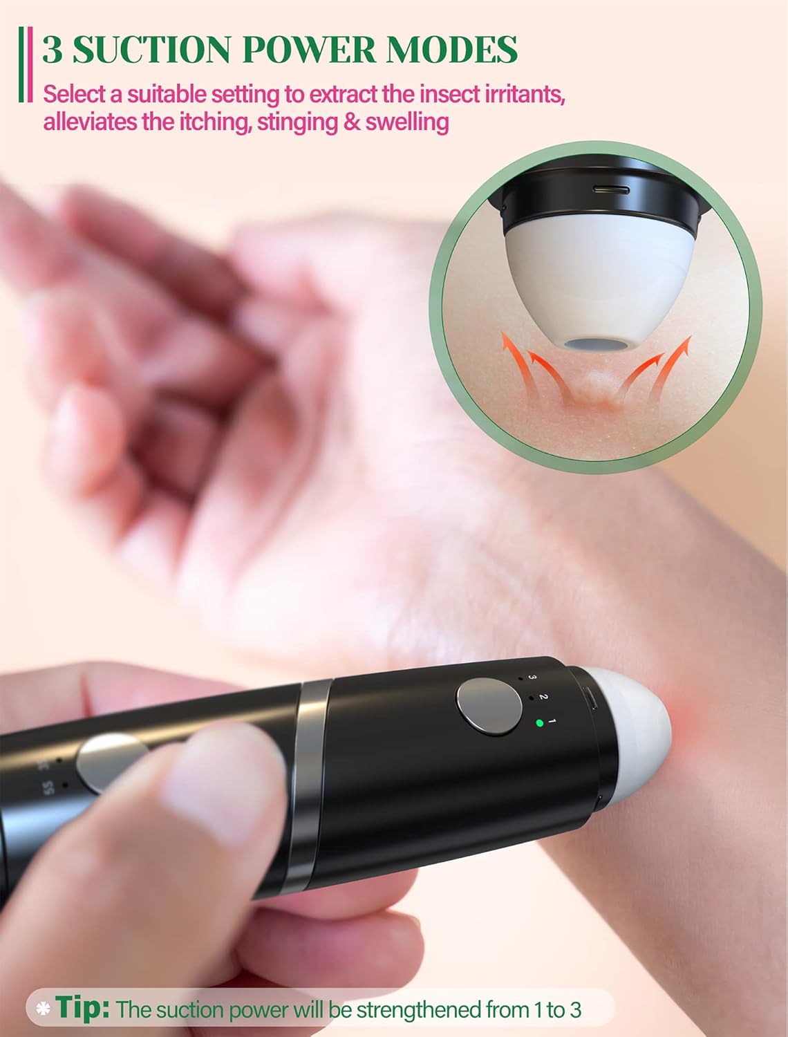 Chemical-Free Relief for Whole Family: This bug bite relief works with safe and physical technology, only with heat and suction power. No chemicals or mess, suitable for pregnant women and children. Warm tips: The heat tip is recommended for ages 12+, and the suction tool suitable for everyone.