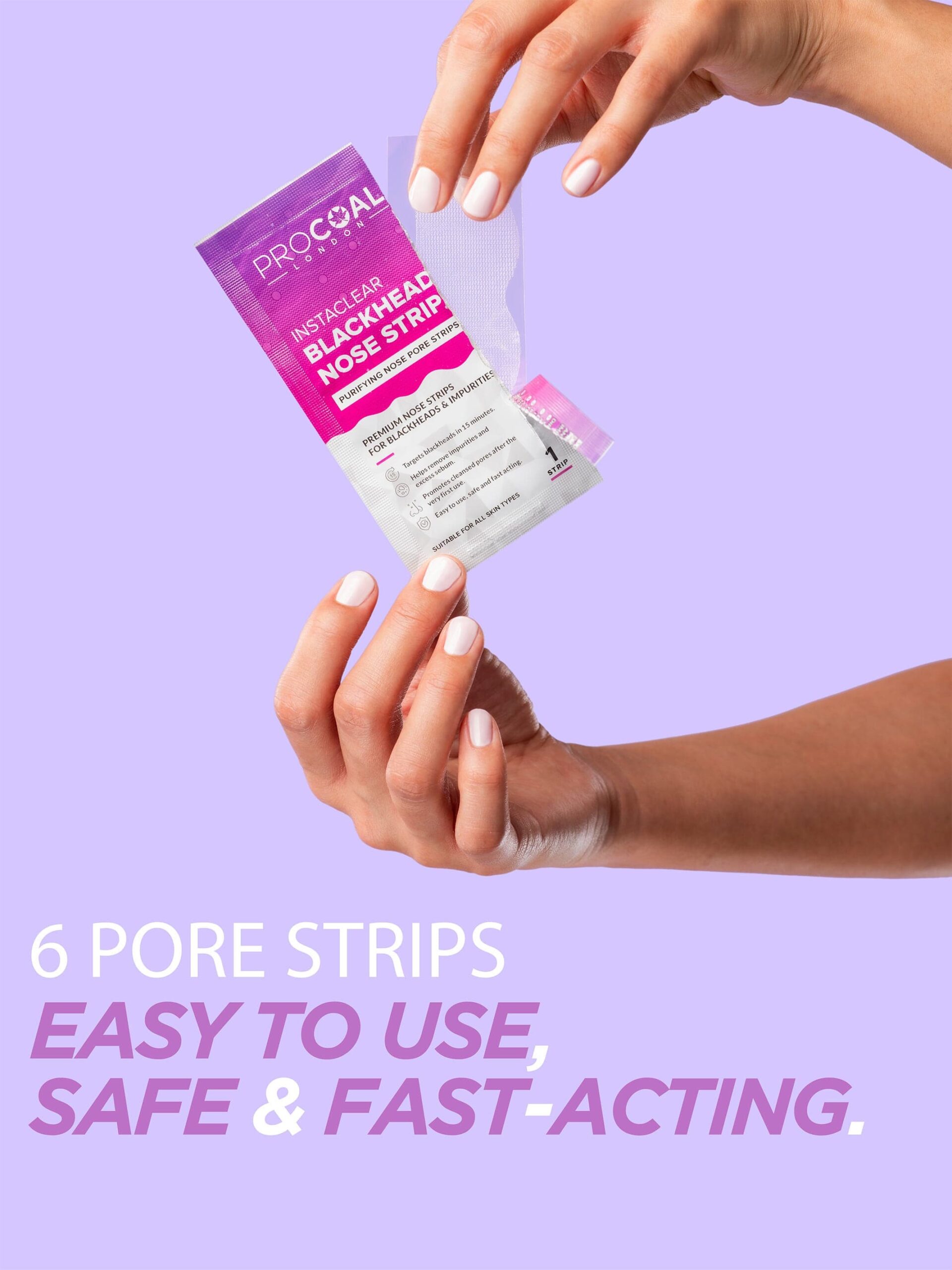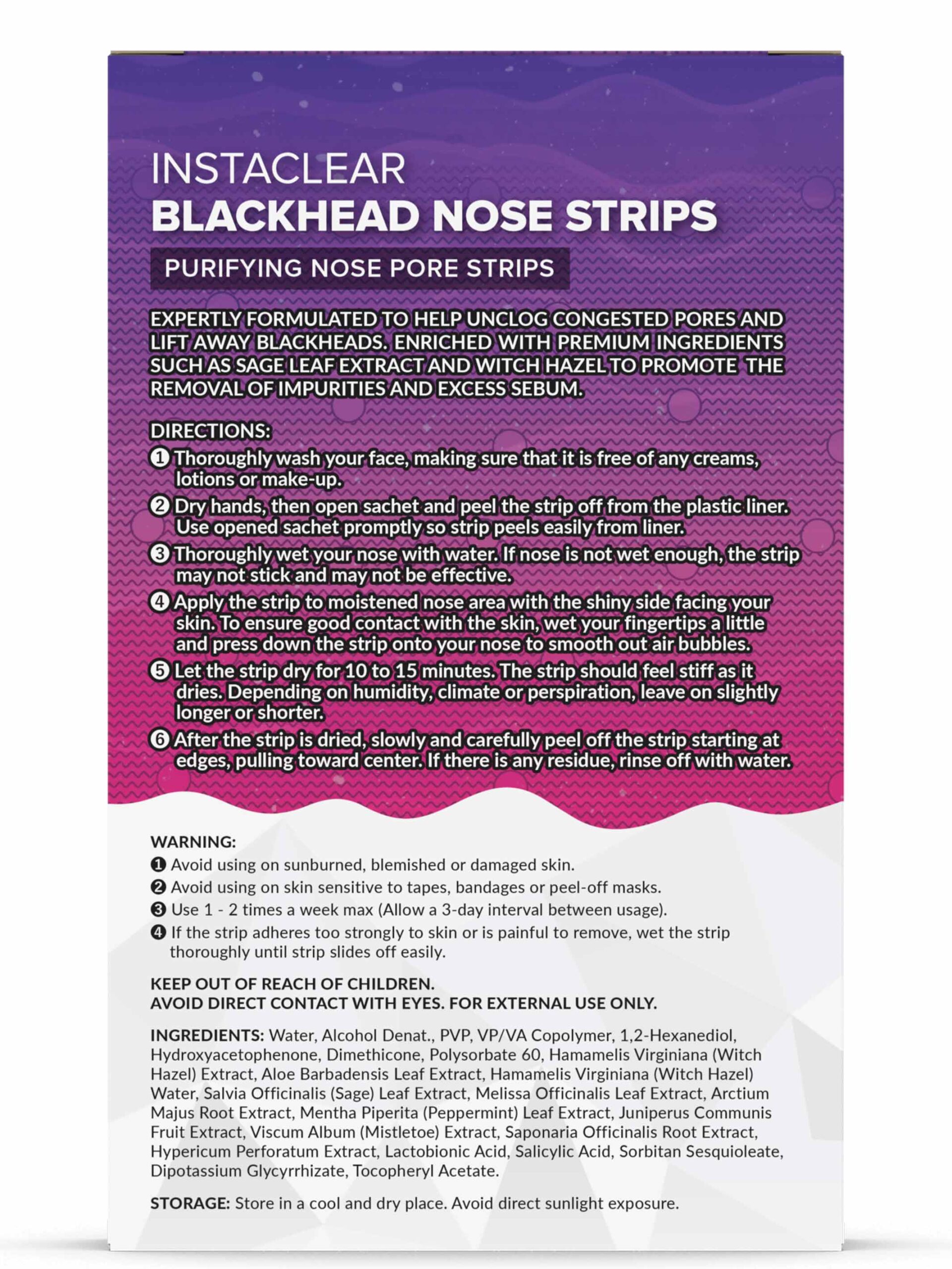 Formulated with Tea Tree, Salicylic Acid and Lactobionic Acid, the Instaclear Blackhead Nose Strips will have unwanted and bothersome blackheads running for the hills, or at least removed in one peel away strip. Allow the potent blend of blemish combating ingredient restore clarity to your skin and make blackheads a thing of the past.