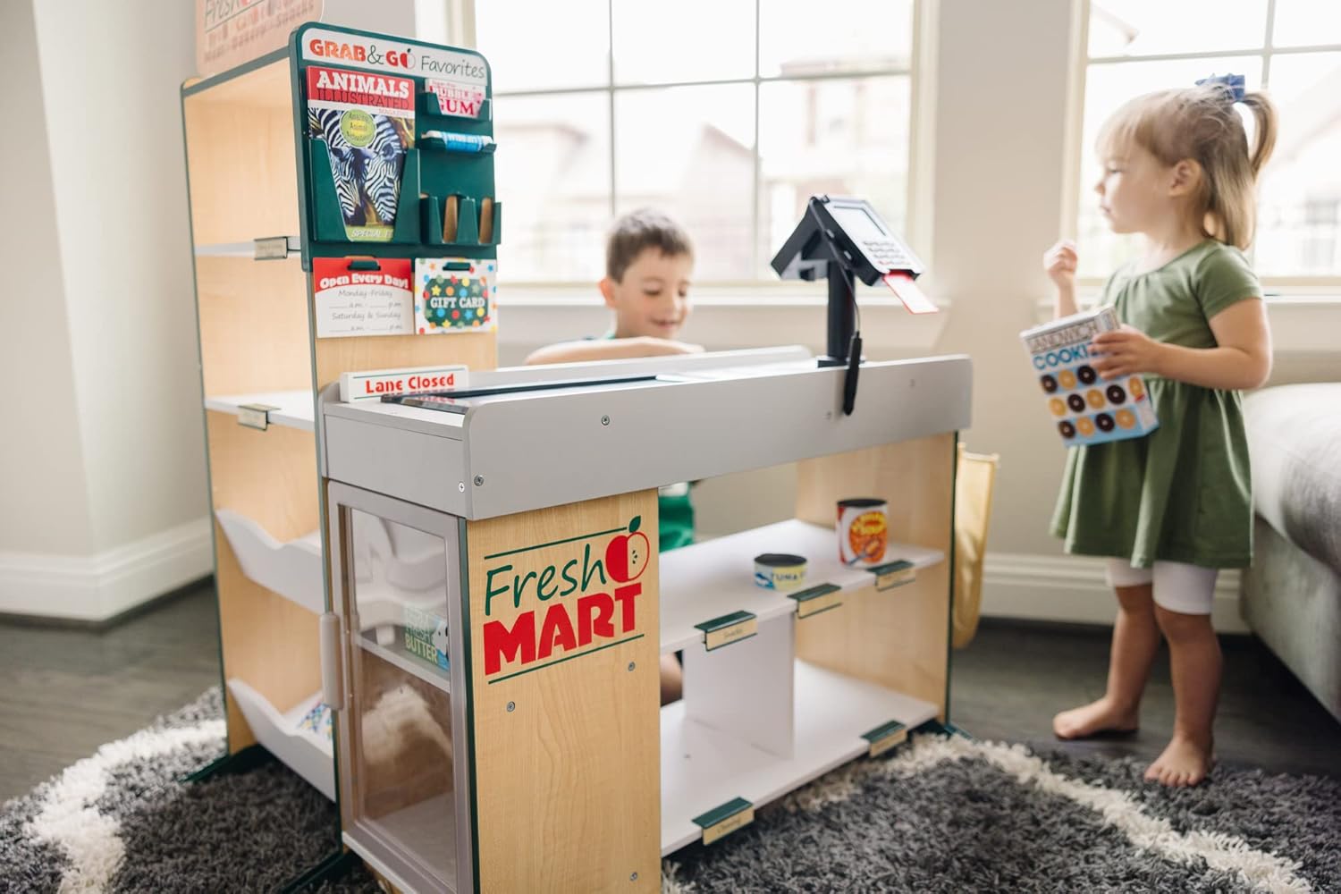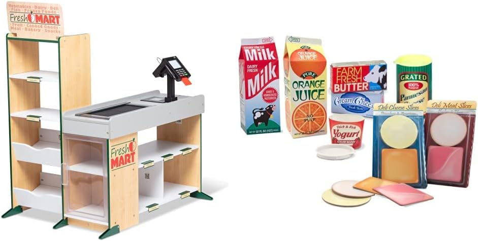 Shopping and playful purchasing is exciting at the sturdy wooden Fresh Mart Grocery Store! The free-standing play space with smooth, curved corners and edges lets customers three and older browse the shelves and pay for purchases on one side, and allows the grocer to ring up items on the other. Realistic features include beeping “scanner,” a hand-crank conveyor belt, a card-swiping machine, a keypad/calculator, and cash drawer. Styles and colors may vary. Kids are sure to find everything on their shopping list at this friendly neighborhood grocery store! This product is certified by the Forest Stewardship Council. FSC certification ensures that products come from responsibly managed forests that provide environmental, social, and economic benefits, and that forests are protected for future generations. Please note that FSC certification applies to new inventory only (FSC C156584)