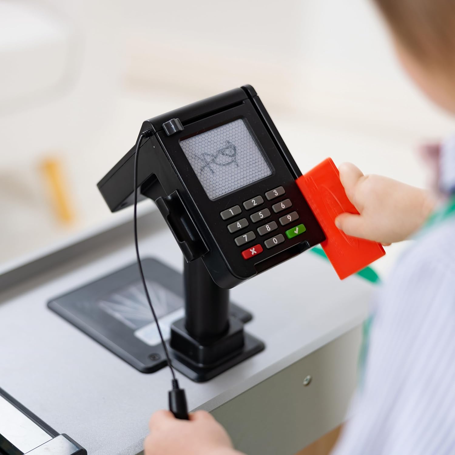 Includes hand-cranked conveyor belt, beeping “scanner,” bagging area, card swipe machine, and cash drawer