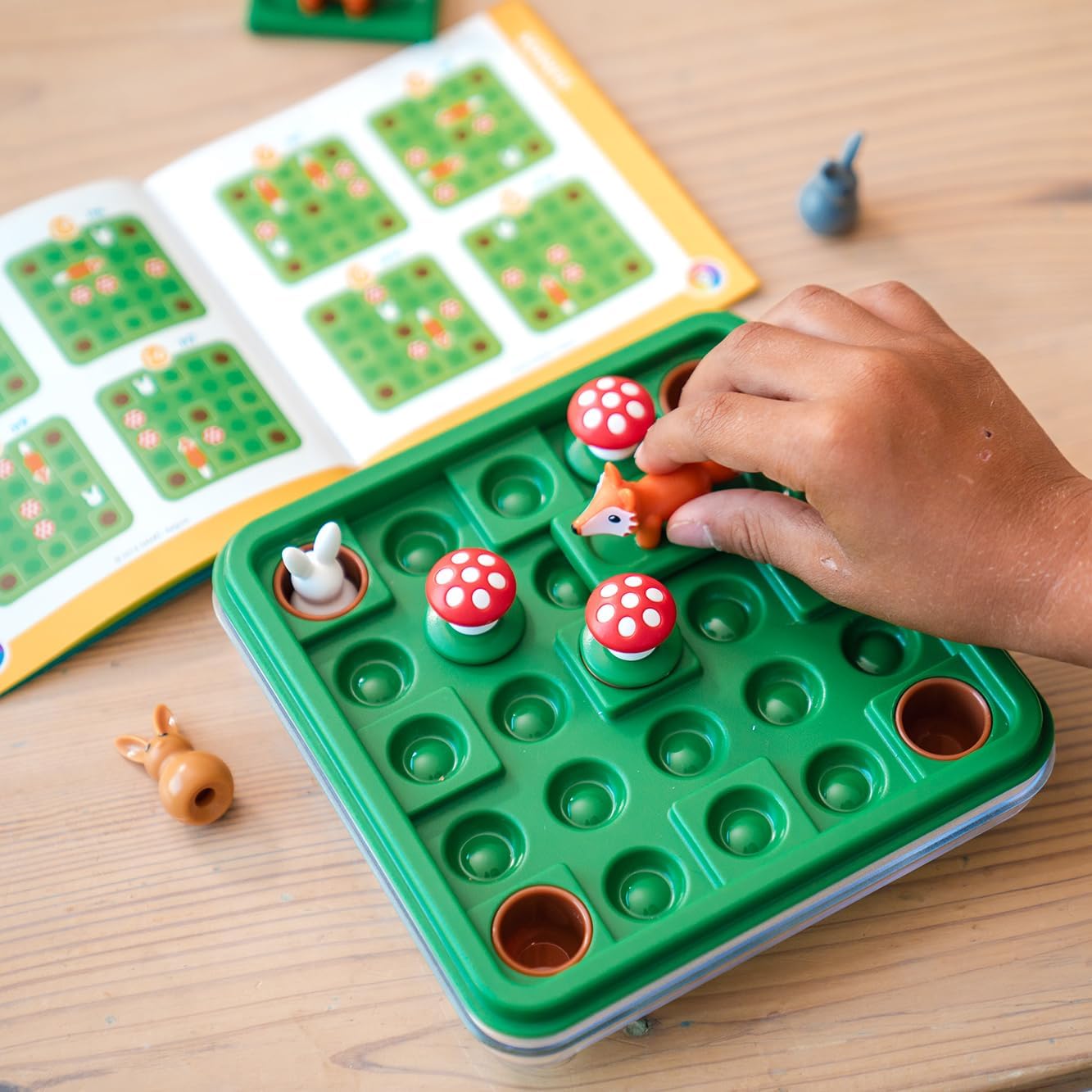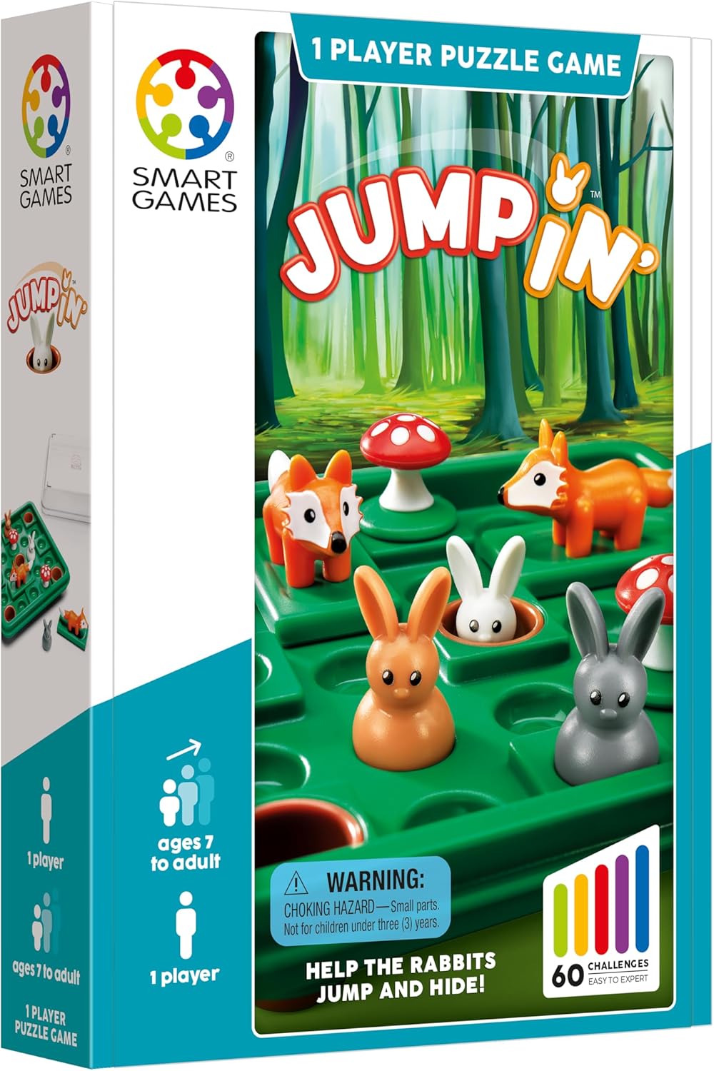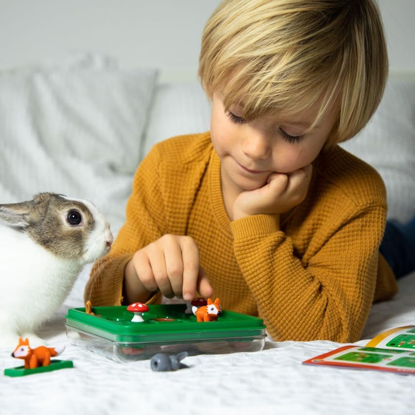 Set Includes: 1 compact game board with transparent lid, 3 Rabbits, 2 sliding foxes, mushrooms, and a booklet with 60 challenges and solutions. Don’t forget to download our free app with features that enhance the experience of physical SmartGames.