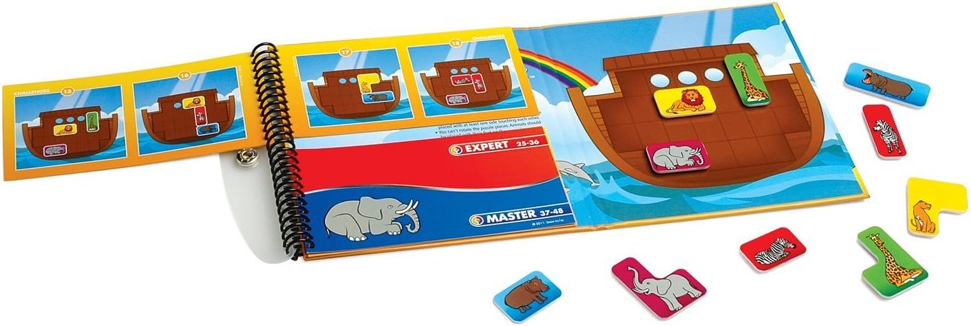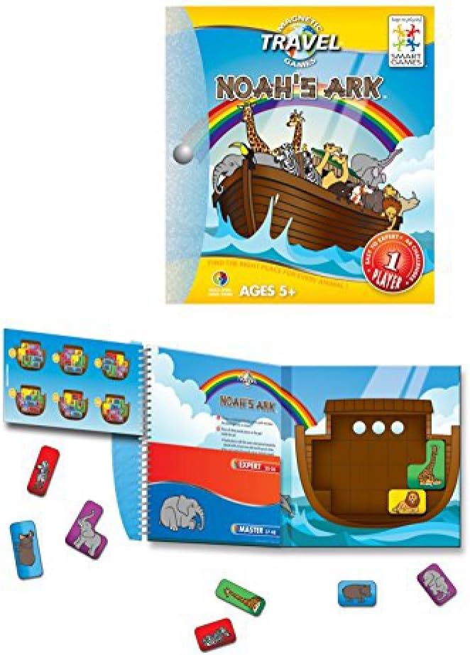 From SmartGames, the worldwide leader in single player puzzle games, comes Noah’s Ark. To solve each challenge players arrange the magnetic animals on the board until they are all inside the ark, each with its mate as shown in the included booklet. With simple challenges for beginners to complex puzzles that will challenge experienced players, Noah’s Ark is a great travel game and a fun way to develop logical thinking skills and spatial reasoning abilities.