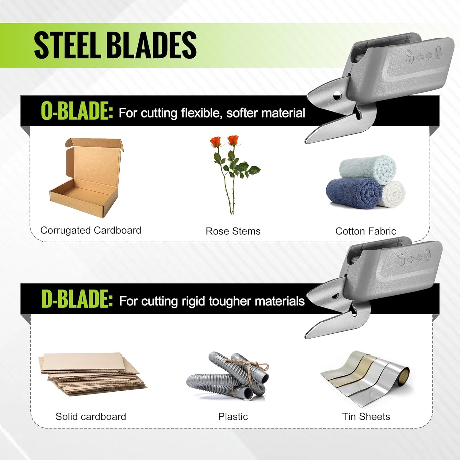 [SHARP BLADES & MULTI PURPOSE] Electric cordless scissors come with 2 sharp blades(O blade; D blade), and high rotation up to 10000RPM, which enables you to cut fabric, cardboard, cloth, leather, paper, plastics, wallpaper, carpet and even tin/aluminum sheet easily and quickly. It’s also a good helper to crafter, seamstress, and home DIY.